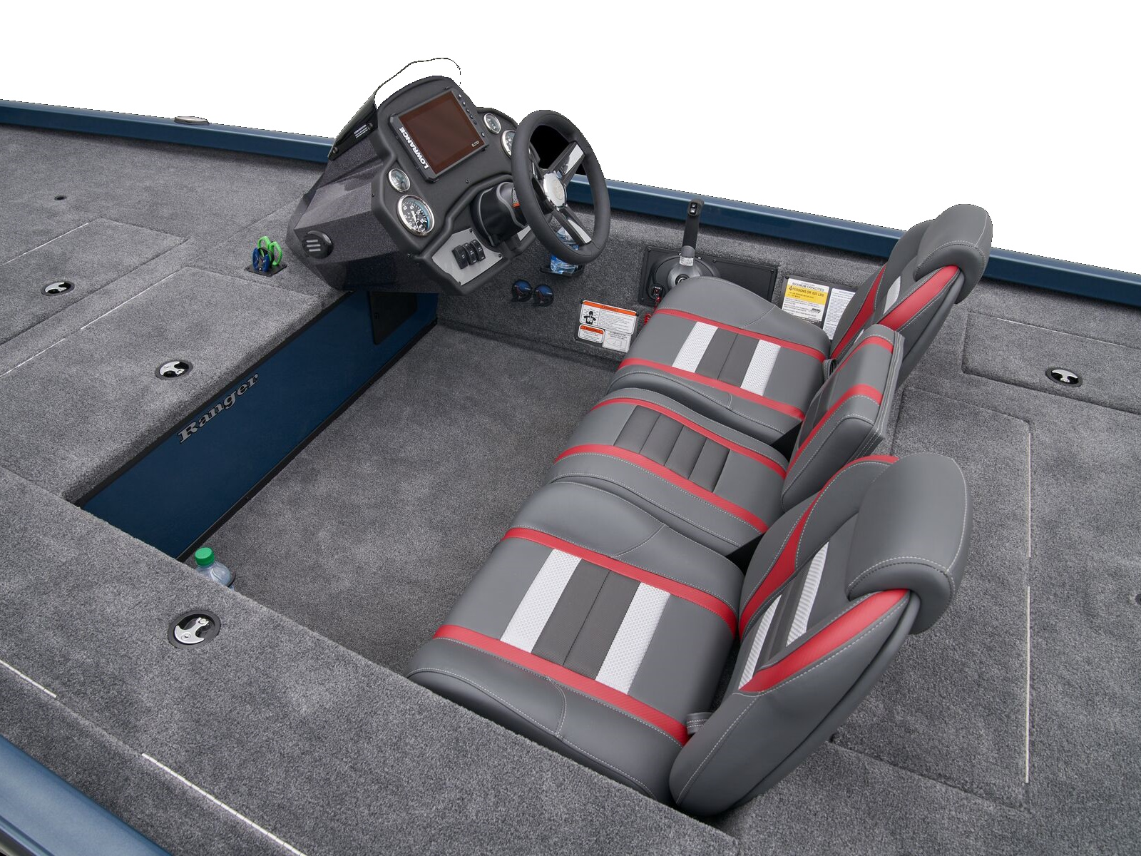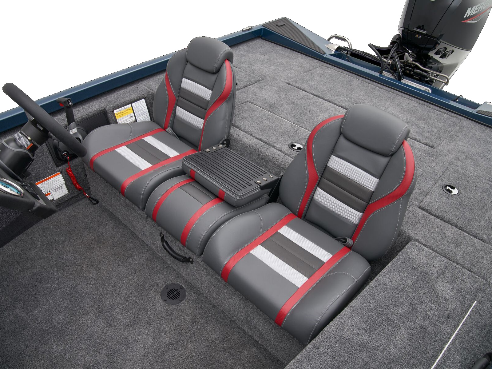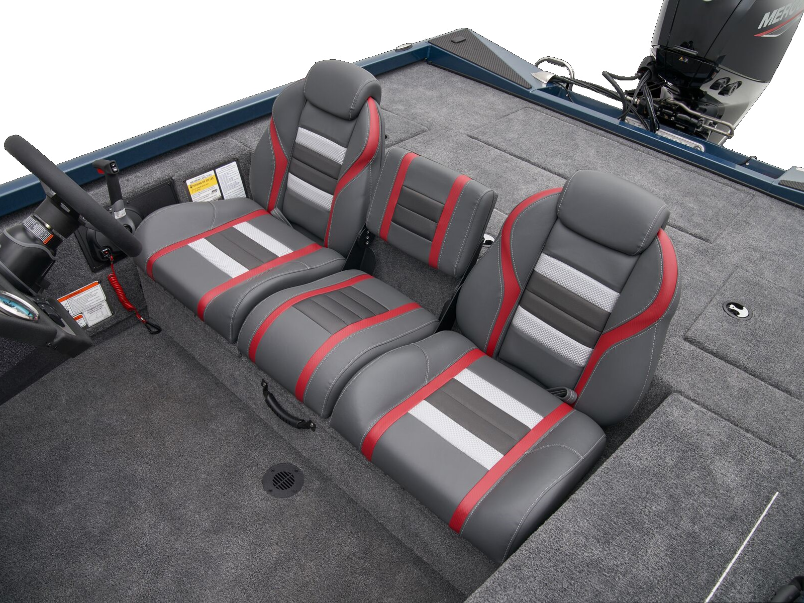 - Custom fitted marine upholstery- driver/passenger bucket seating w/ center fold down & two matching fishing seats