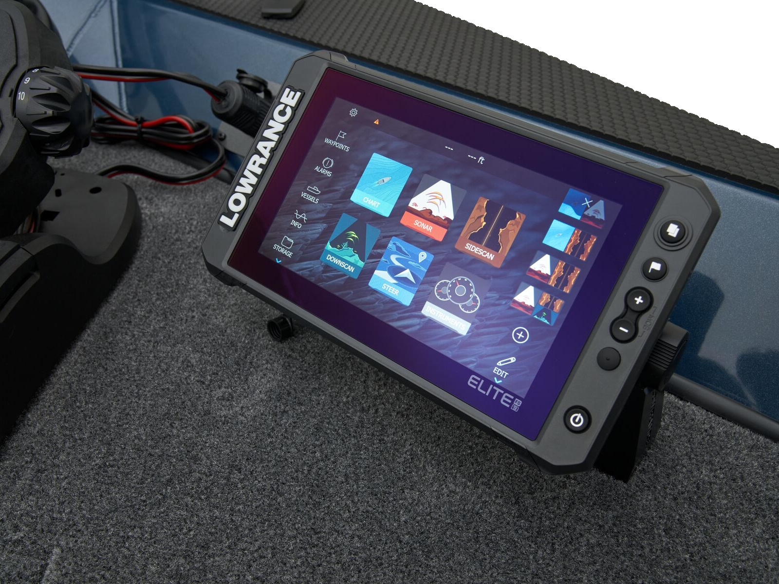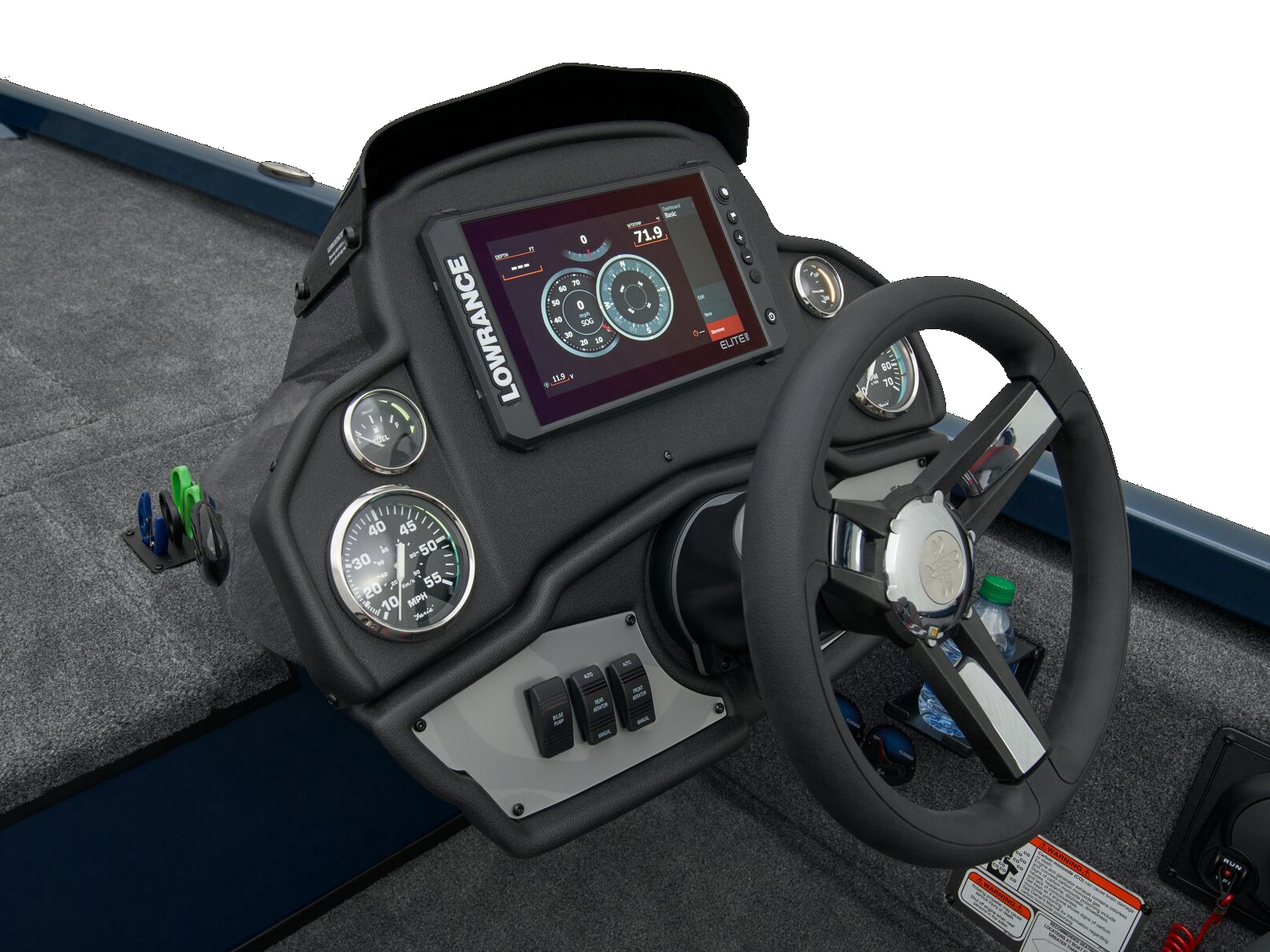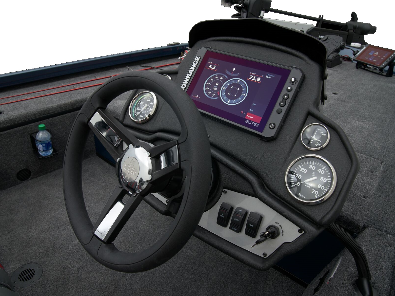 - Custom fiberglass console w/ flush-mounted depthfinder, tach, speed, fuel, trim gauge & easy touch switching