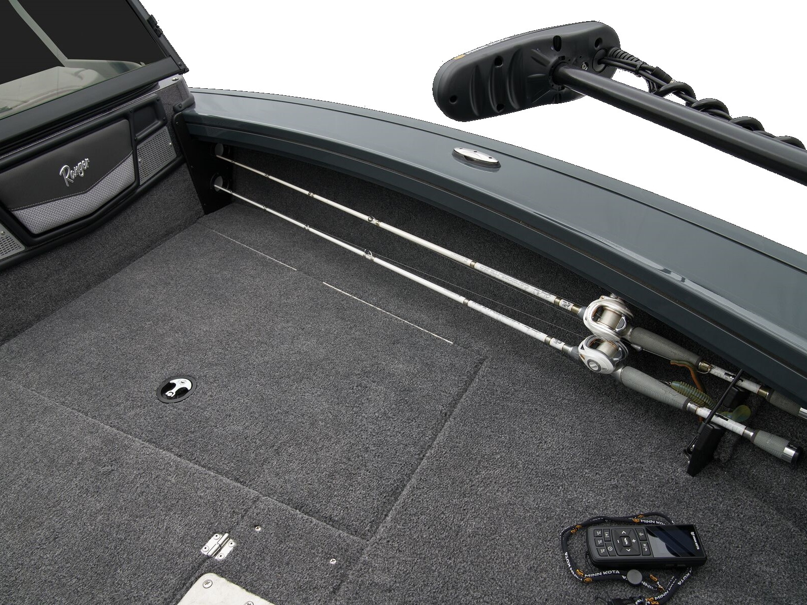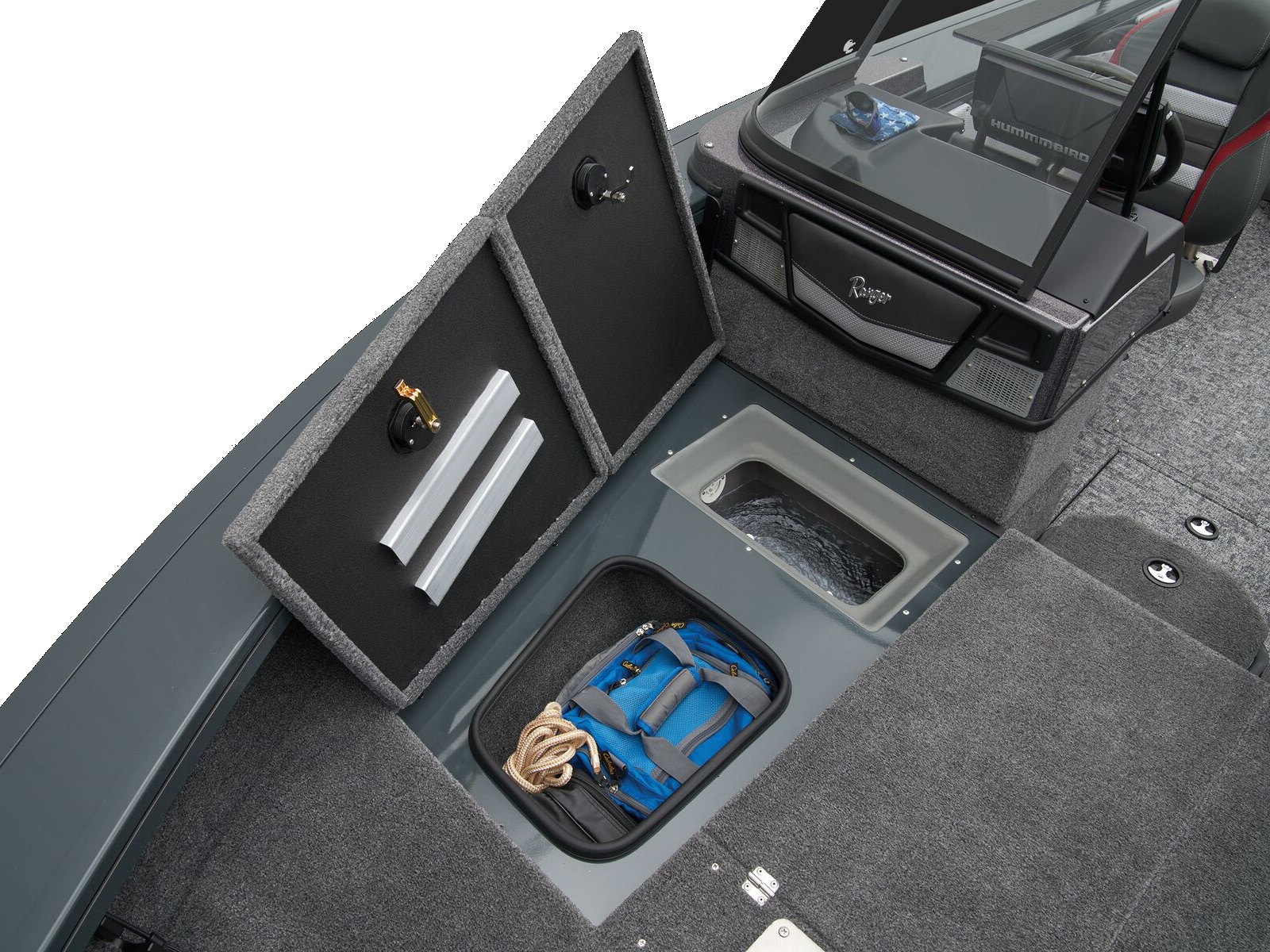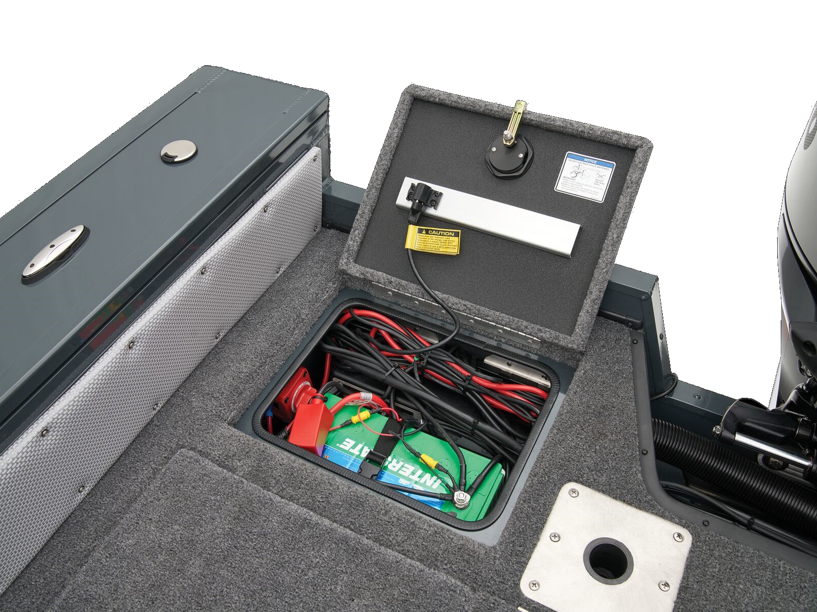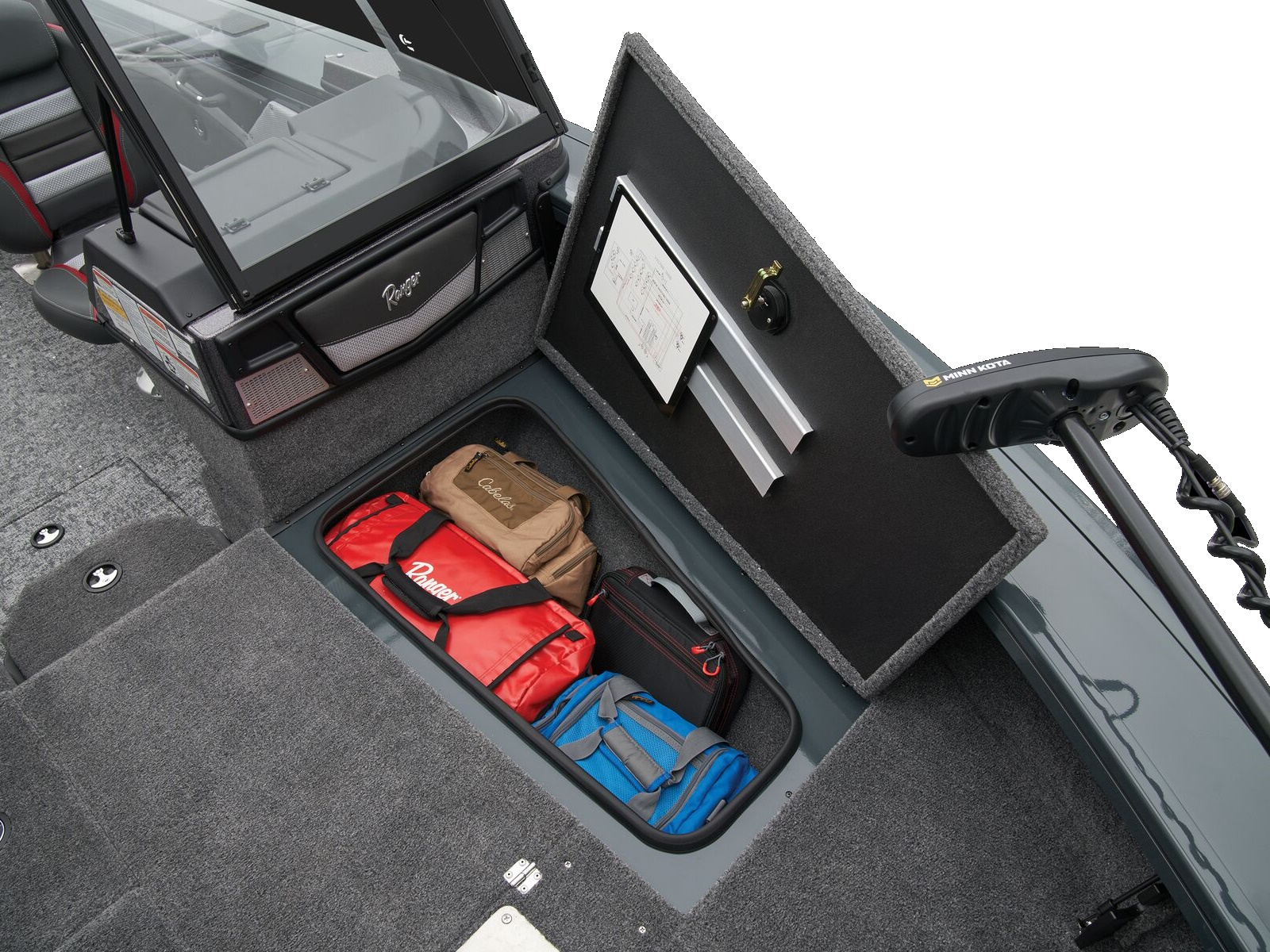 - Trolling Motor pedal storage (hinged lid over recessed trolling motor pedal, for use with digital-steer TMs)