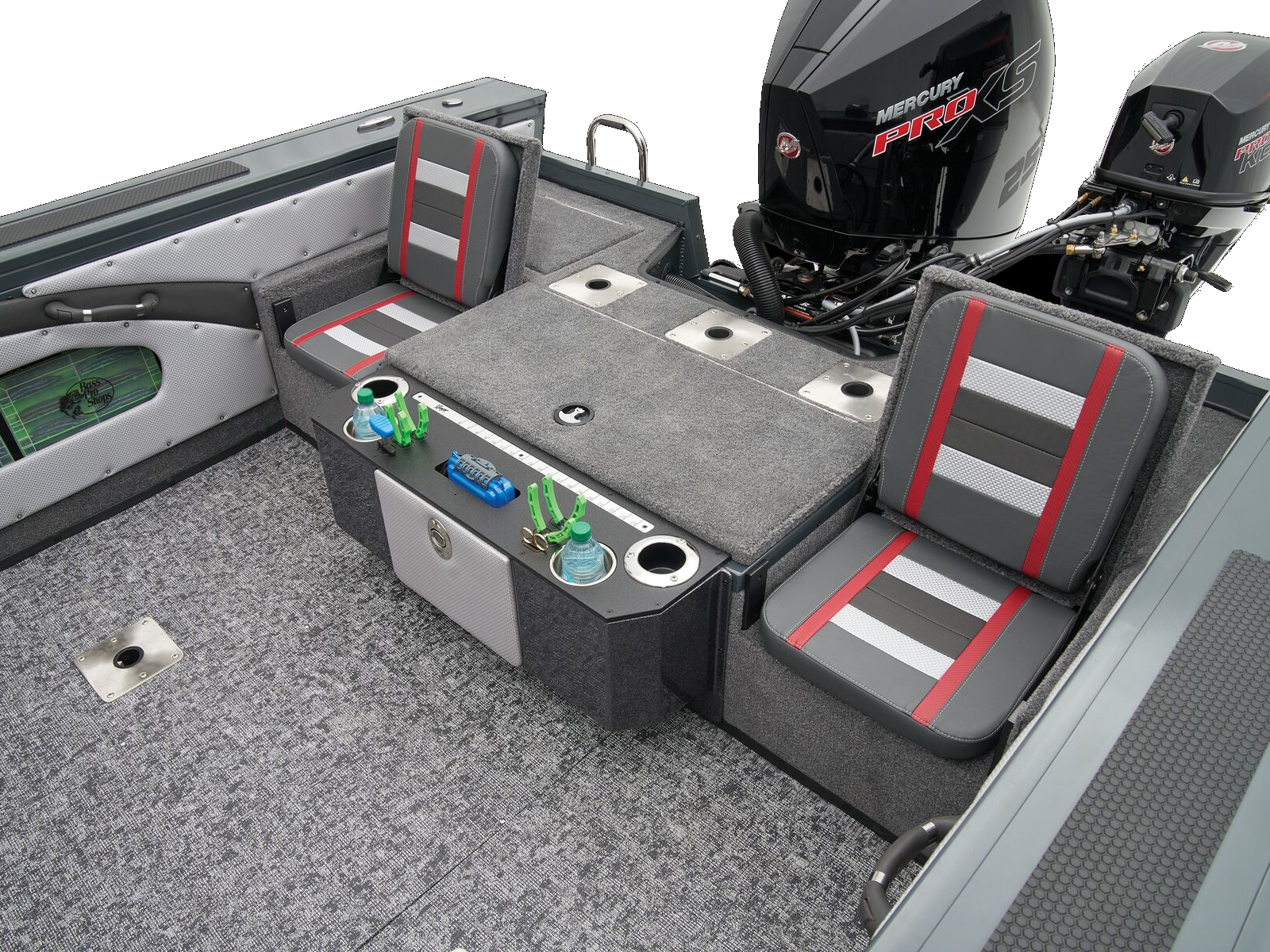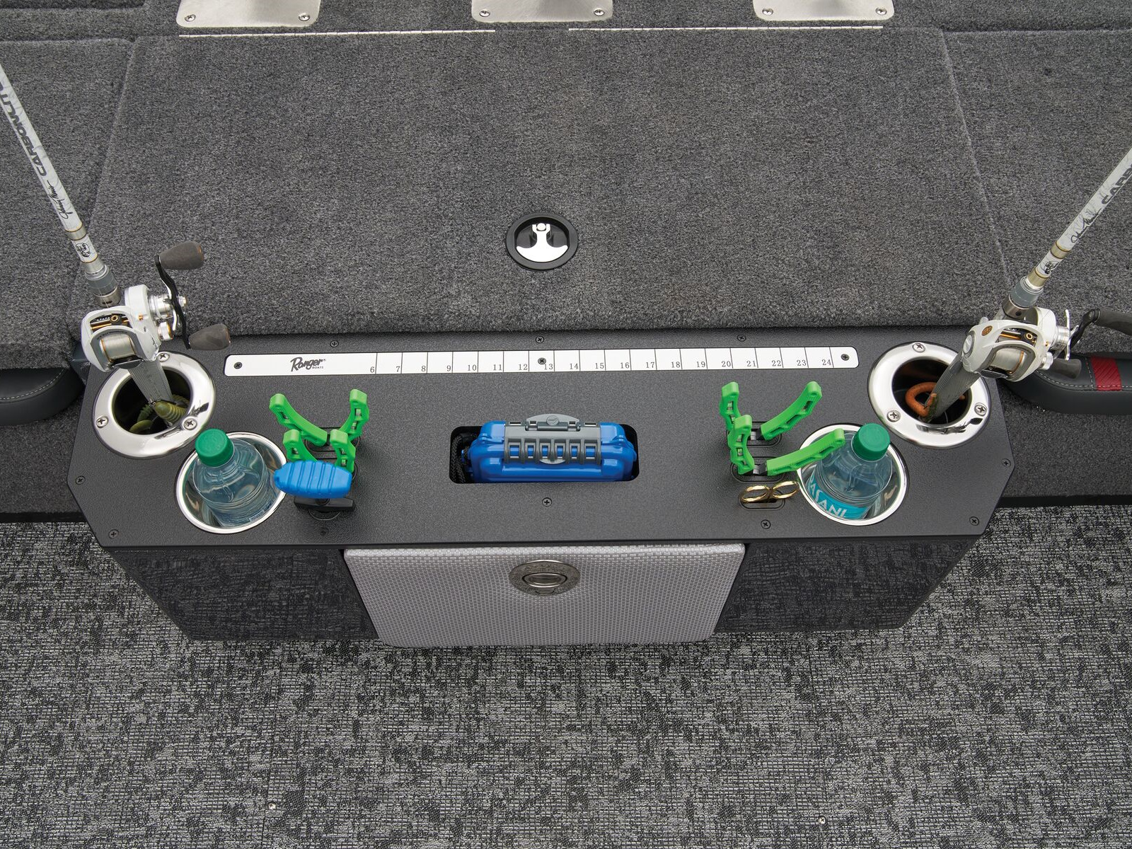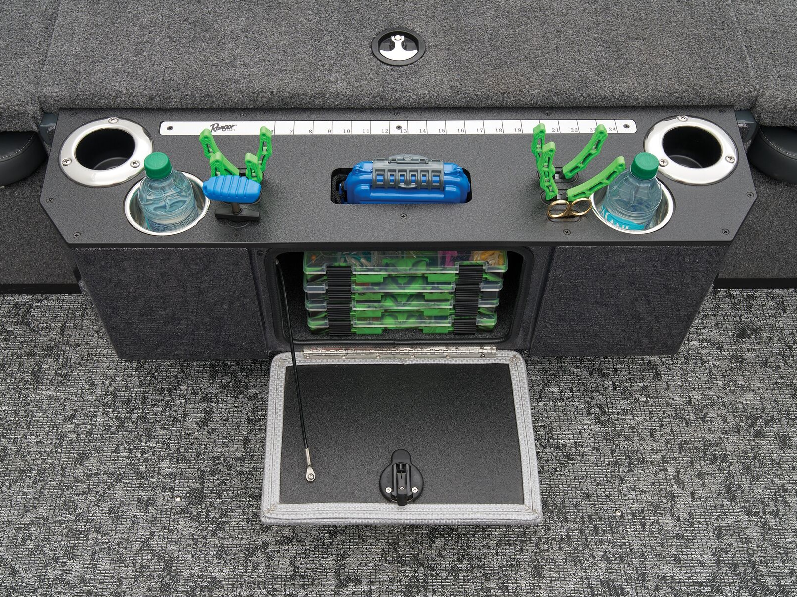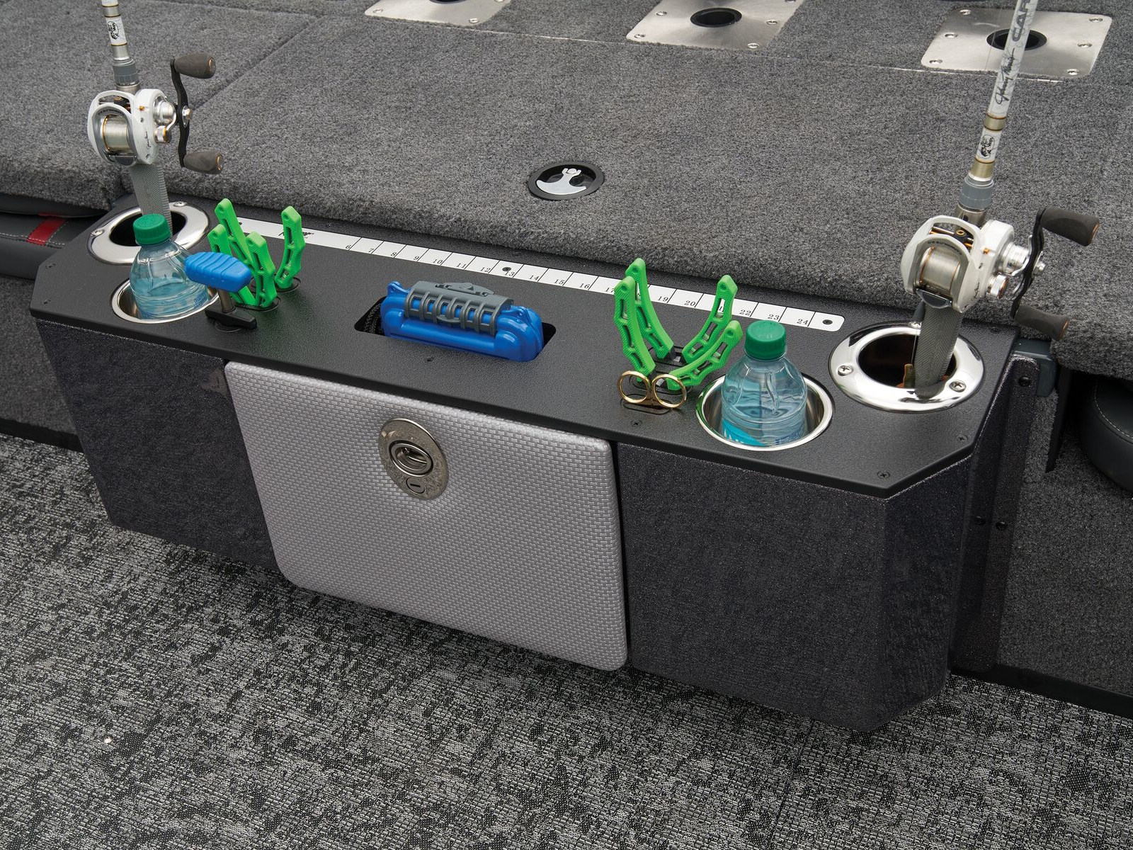 - Aft fiberglass storage center with flip-down lid, cup holders, tool holders, and measuring board on top