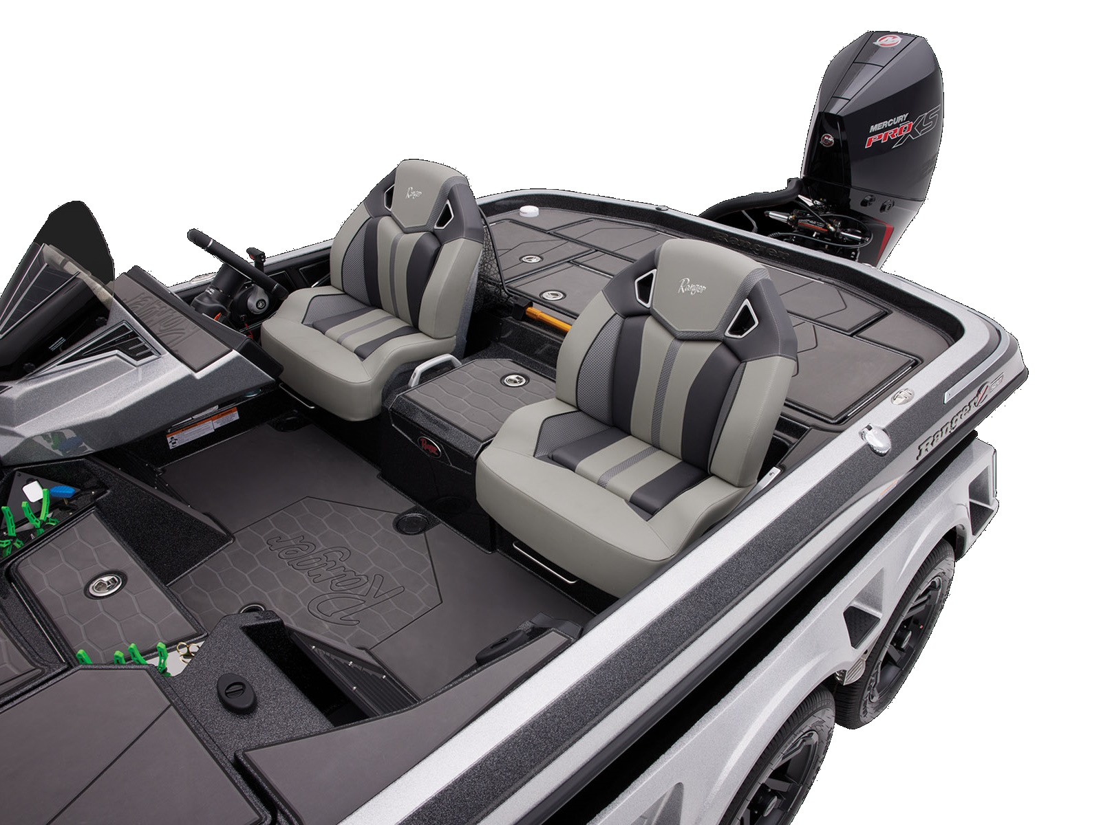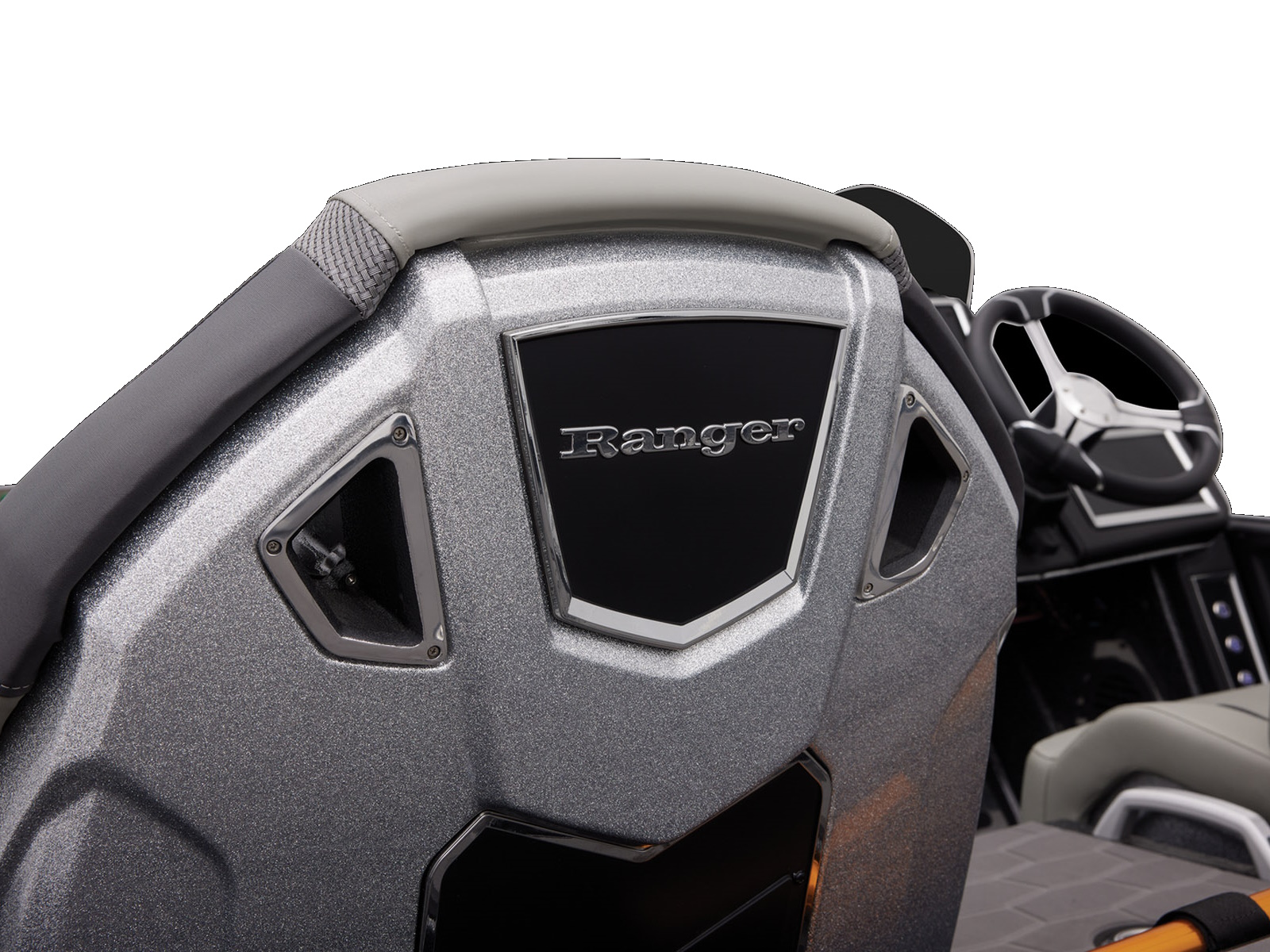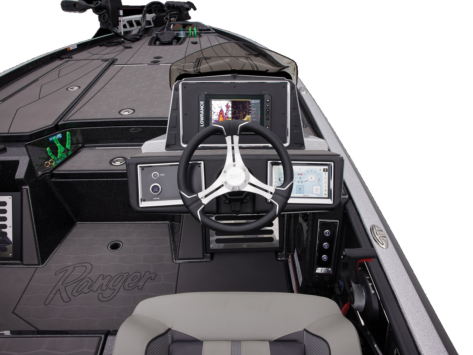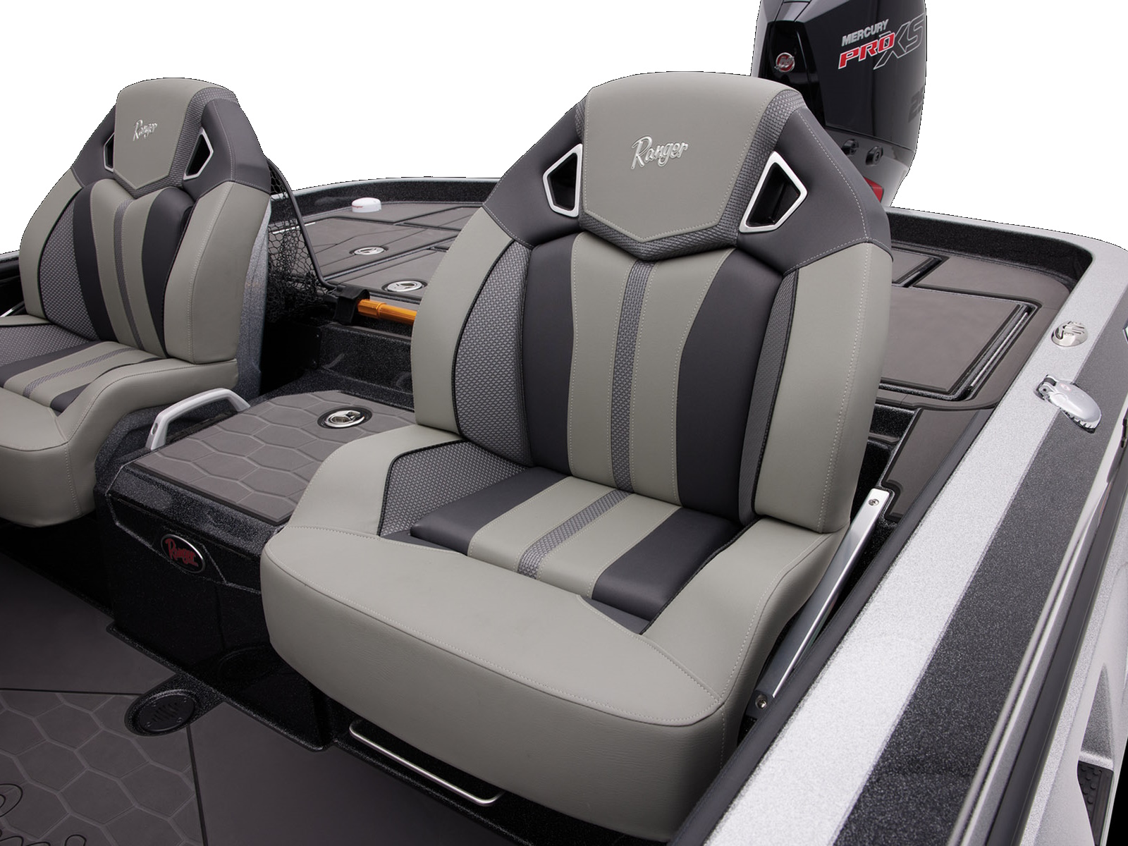 An all-new console carries dual graphs or a single 16” unit and the touchscreen Ranger R.I.D.E. system integrates total control over every boat and engine function. The all-new seats rest on easy-to-adjust slides and the color-matched fiberglass shellbacks take the aesthetic to a new level. A key fob and integrated push-to-start ignition let you start-up quicker and deliver greater security when you’re on the road. Inside the coin box is a wireless phone charger, and in the battery box are standard lithium batteries.