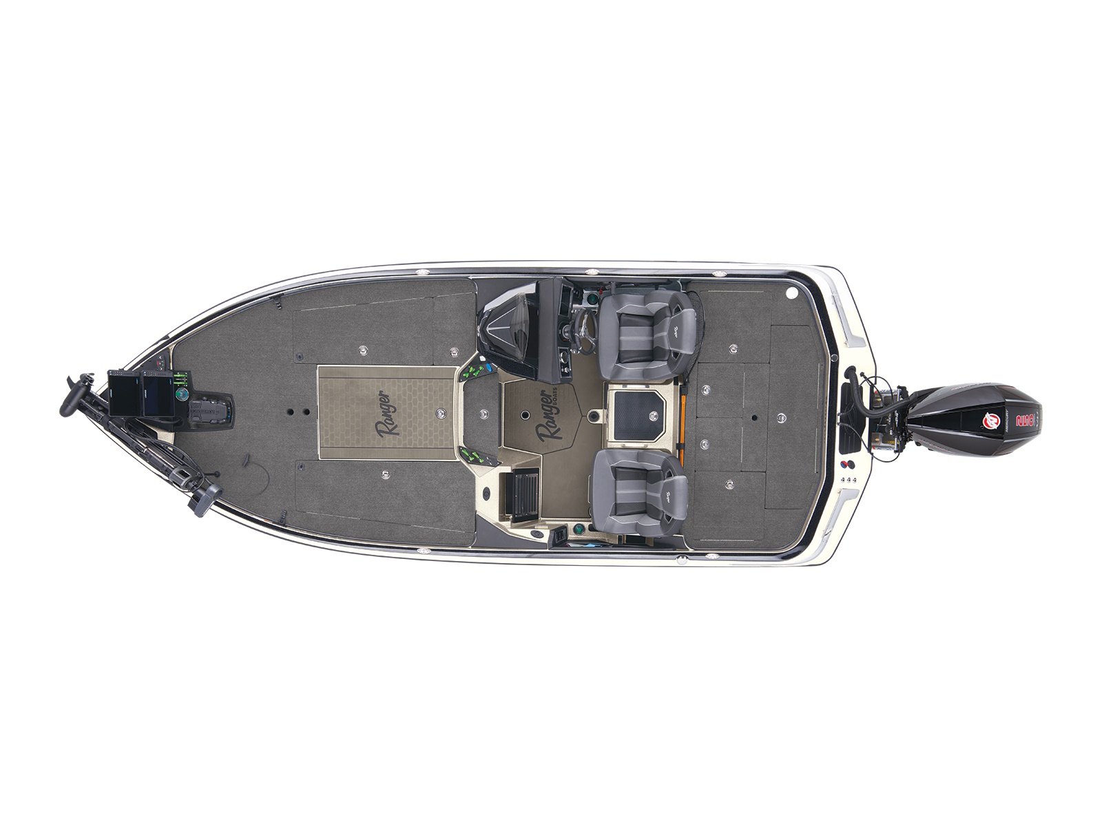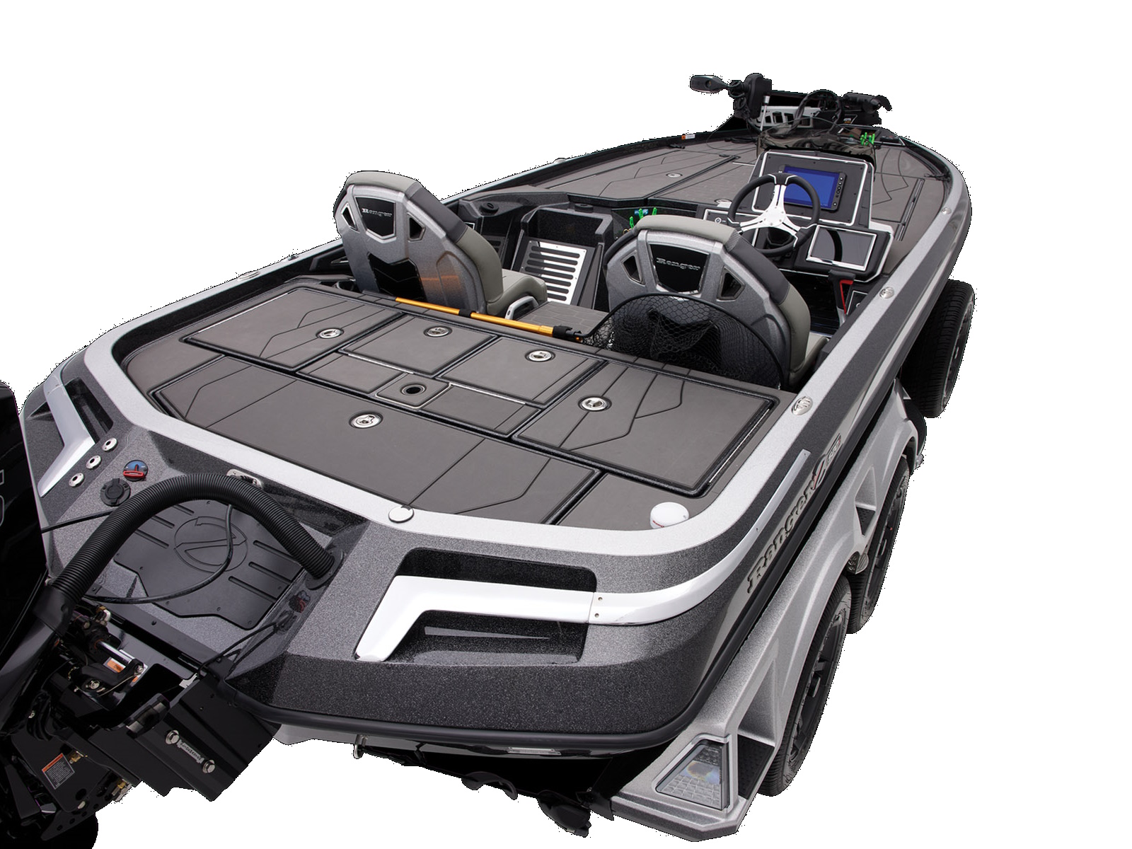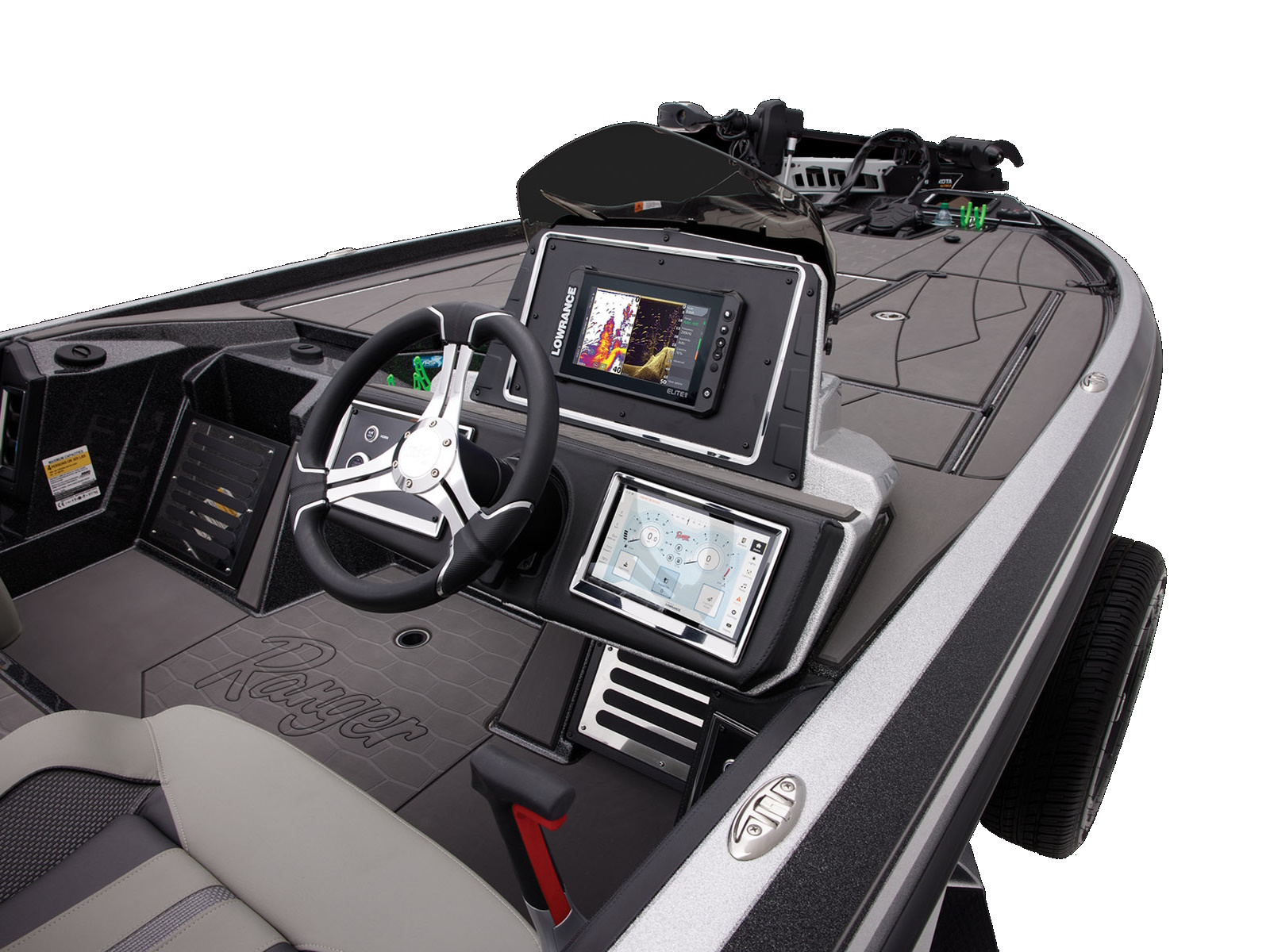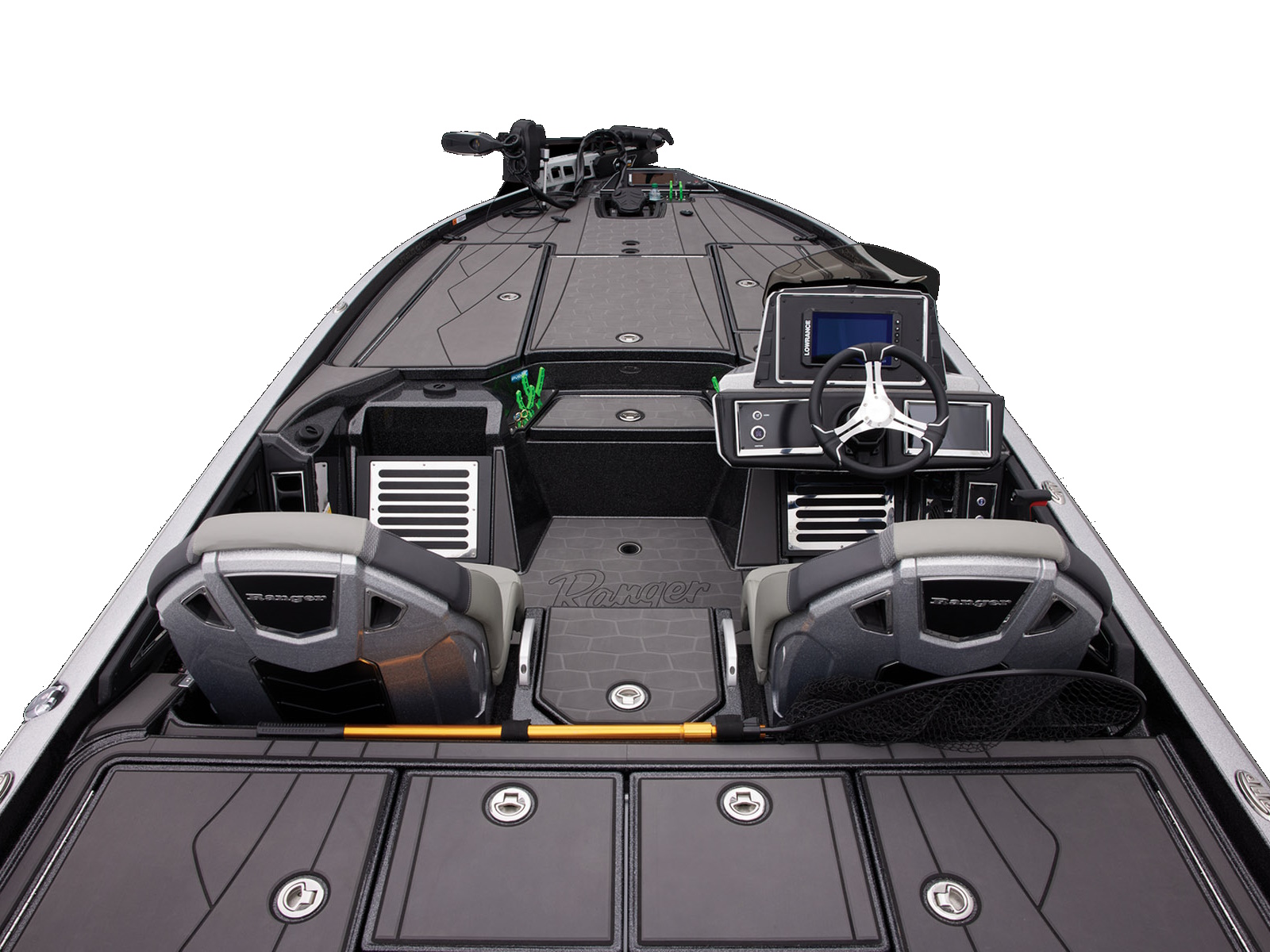 An all-new console carries dual graphs or a single 16” unit and the touchscreen Ranger R.I.D.E. system integrates total control over every boat and engine function. The all-new seats rest on easy-to-adjust slides and the color-matched fiberglass shellbacks take the aesthetic to a new level. A key fob and integrated push-to-start ignition let you start-up quicker and deliver greater security when you’re on the road. Inside the coin box is a wireless phone charger, and in the battery box are standard lithium batteries.