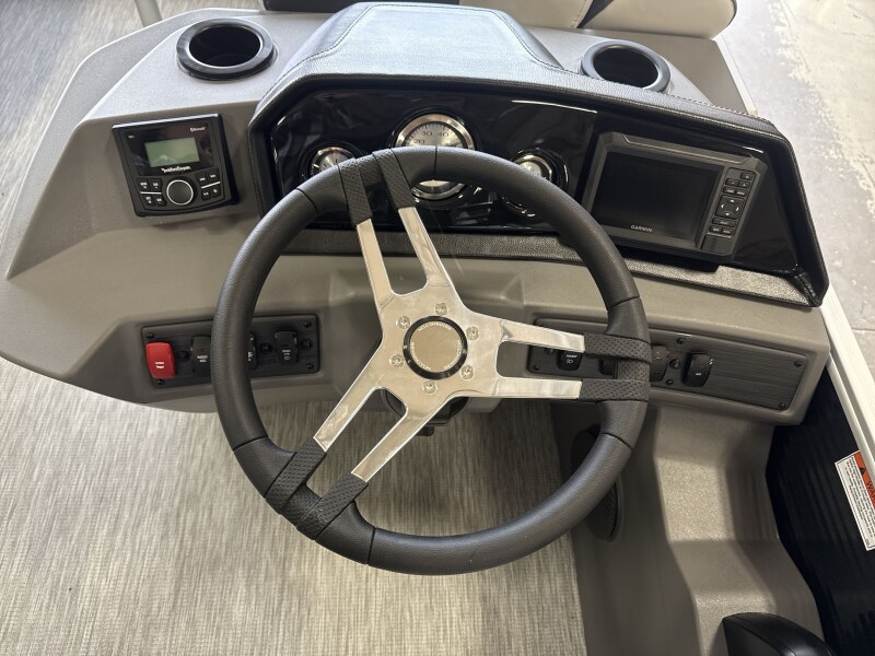 - Electronics: Features a modern console with a Rockford Fosgate stereo, a Garmin display for depth and mapping, and a wireless charging tray with a USB port.